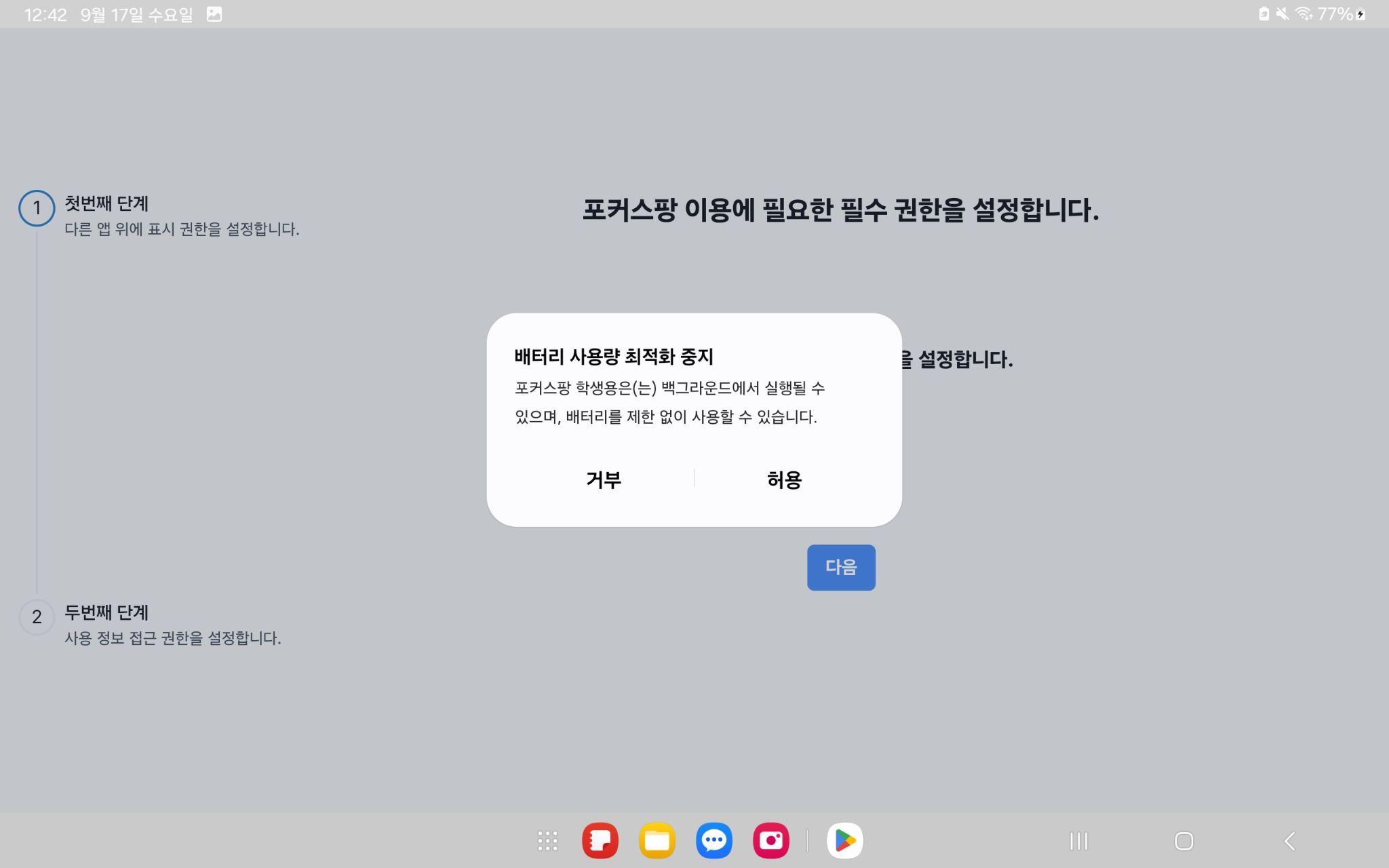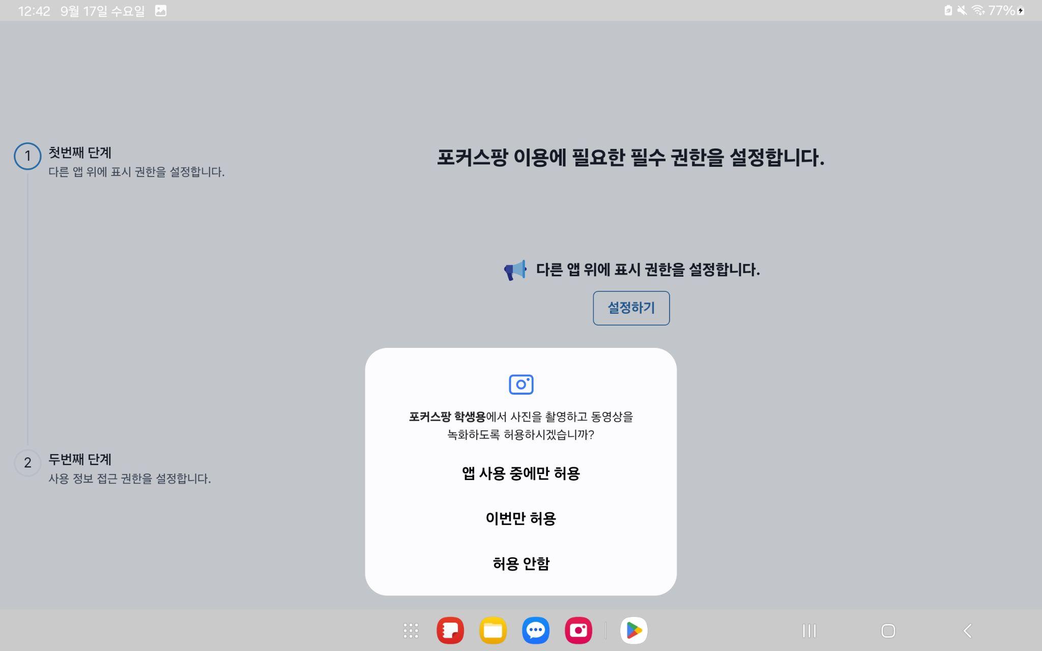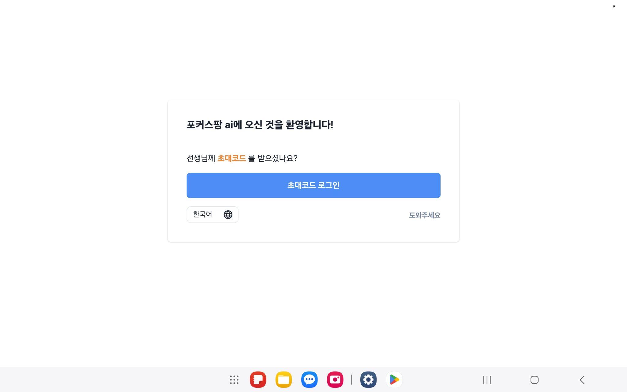 학생1. 설치안드로이드(Android) 설치이 페이지에서안드로이드 태블릿에 포커스팡 설치하기 설치 방법 1단계: 플레이스토어 열기 안드로이드 기기에서 플레이스토어 앱을 찾아 열어주세요. 2단계: 설치 파일 받기 안드로이드용 학생 앱Google Play Store다운로드 위 다운로드 버튼을 누르거나, 플레이스토어에서 "포커스팡 학생용"을 검색해 주세요. 3단계: 앱 설치하기 포커스팡 학생용 앱을 찾았으면 설치 버튼을 눌러주세요. 설치 완료 후 1단계: 앱 실행하기 2단계: 각 권한 허용하기