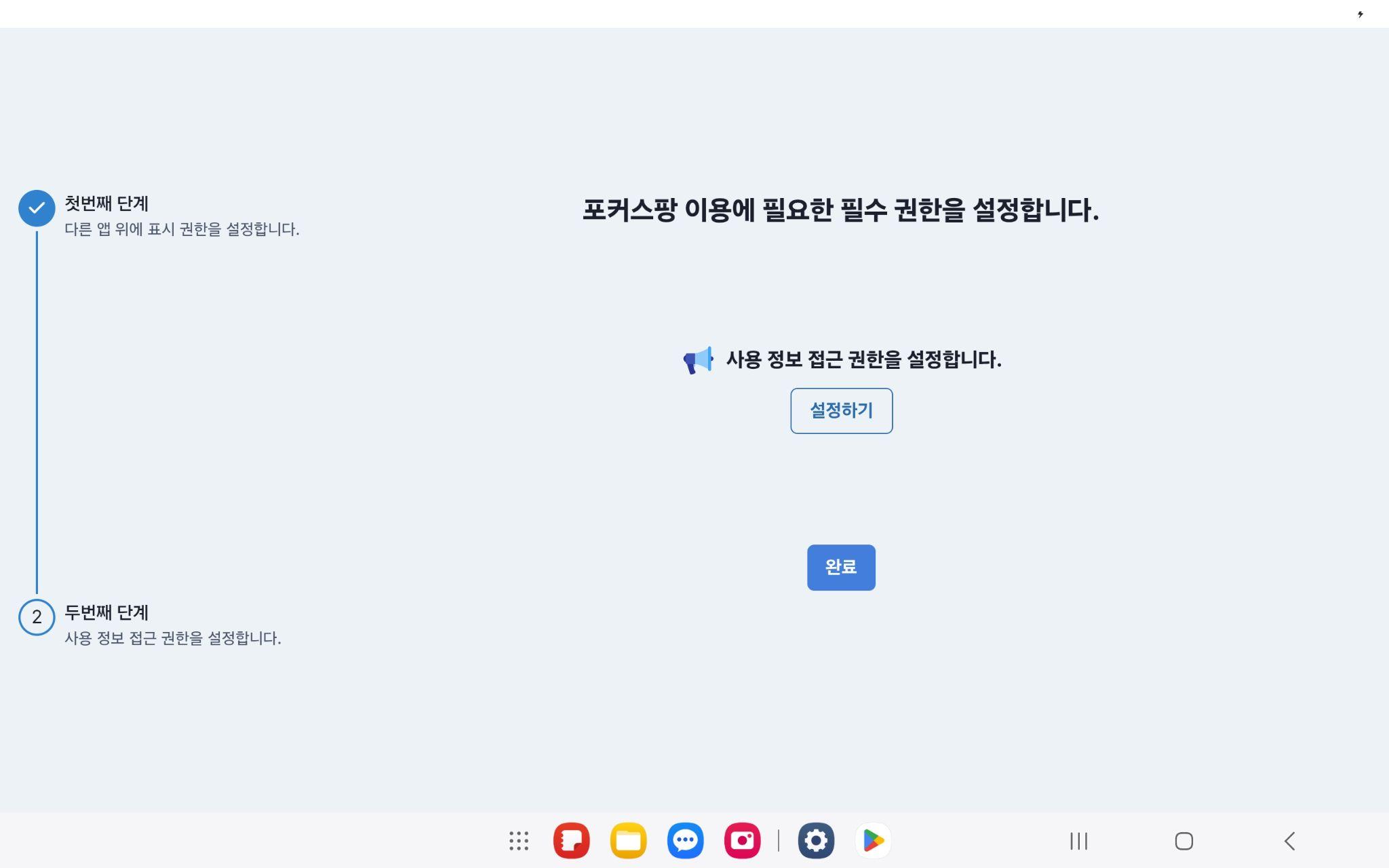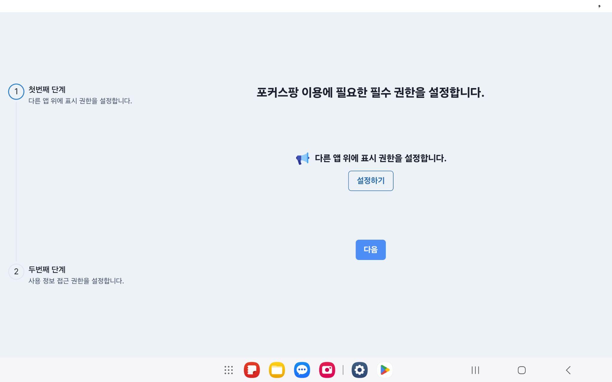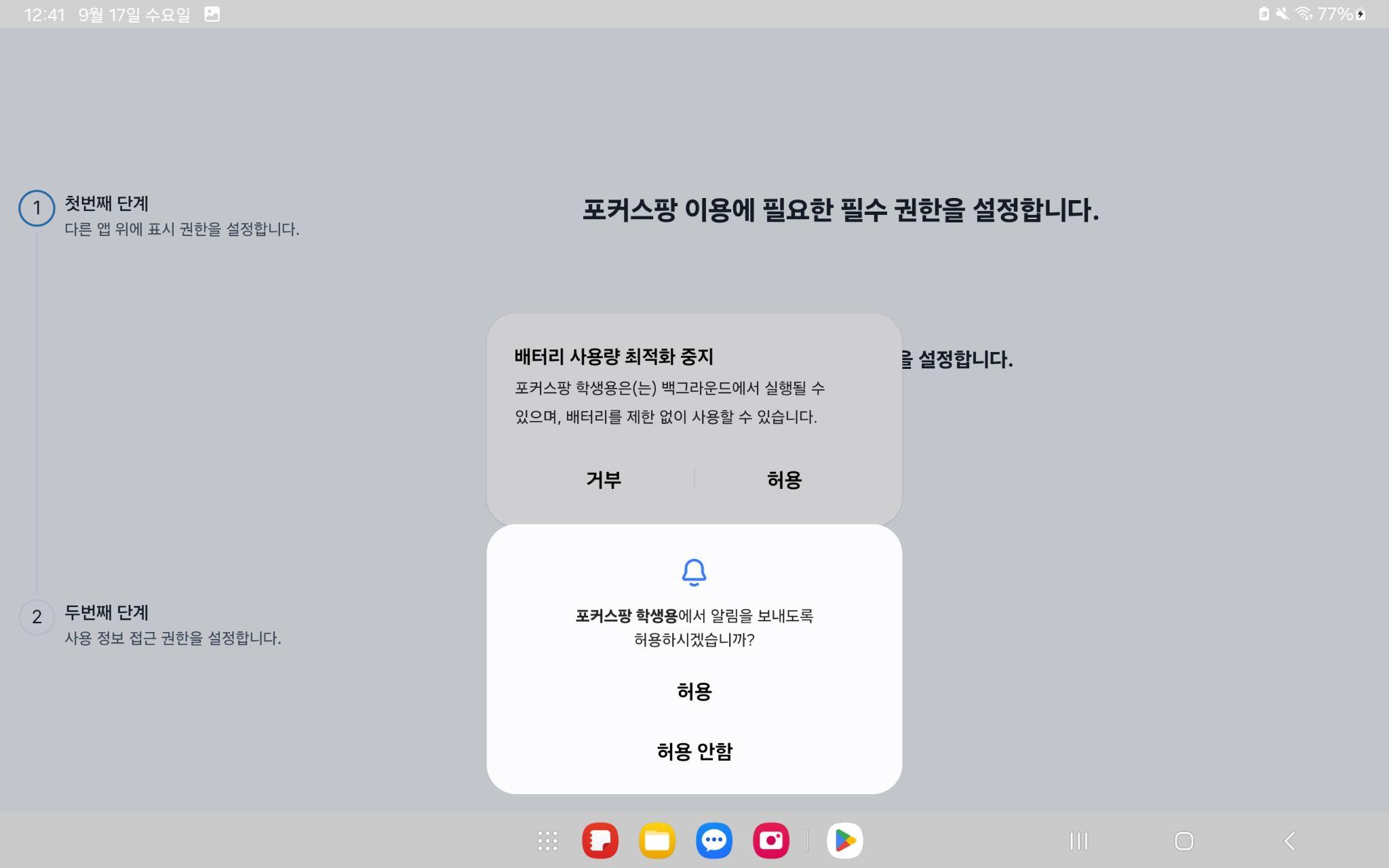 학생1. 설치안드로이드(Android) 설치이 페이지에서안드로이드 태블릿에 포커스팡 설치하기 설치 방법 1단계: 플레이스토어 열기 안드로이드 기기에서 플레이스토어 앱을 찾아 열어주세요. 2단계: 설치 파일 받기 안드로이드용 학생 앱Google Play Store다운로드 위 다운로드 버튼을 누르거나, 플레이스토어에서 "포커스팡 학생용"을 검색해 주세요. 3단계: 앱 설치하기 포커스팡 학생용 앱을 찾았으면 설치 버튼을 눌러주세요. 설치 완료 후 1단계: 앱 실행하기 2단계: 각 권한 허용하기