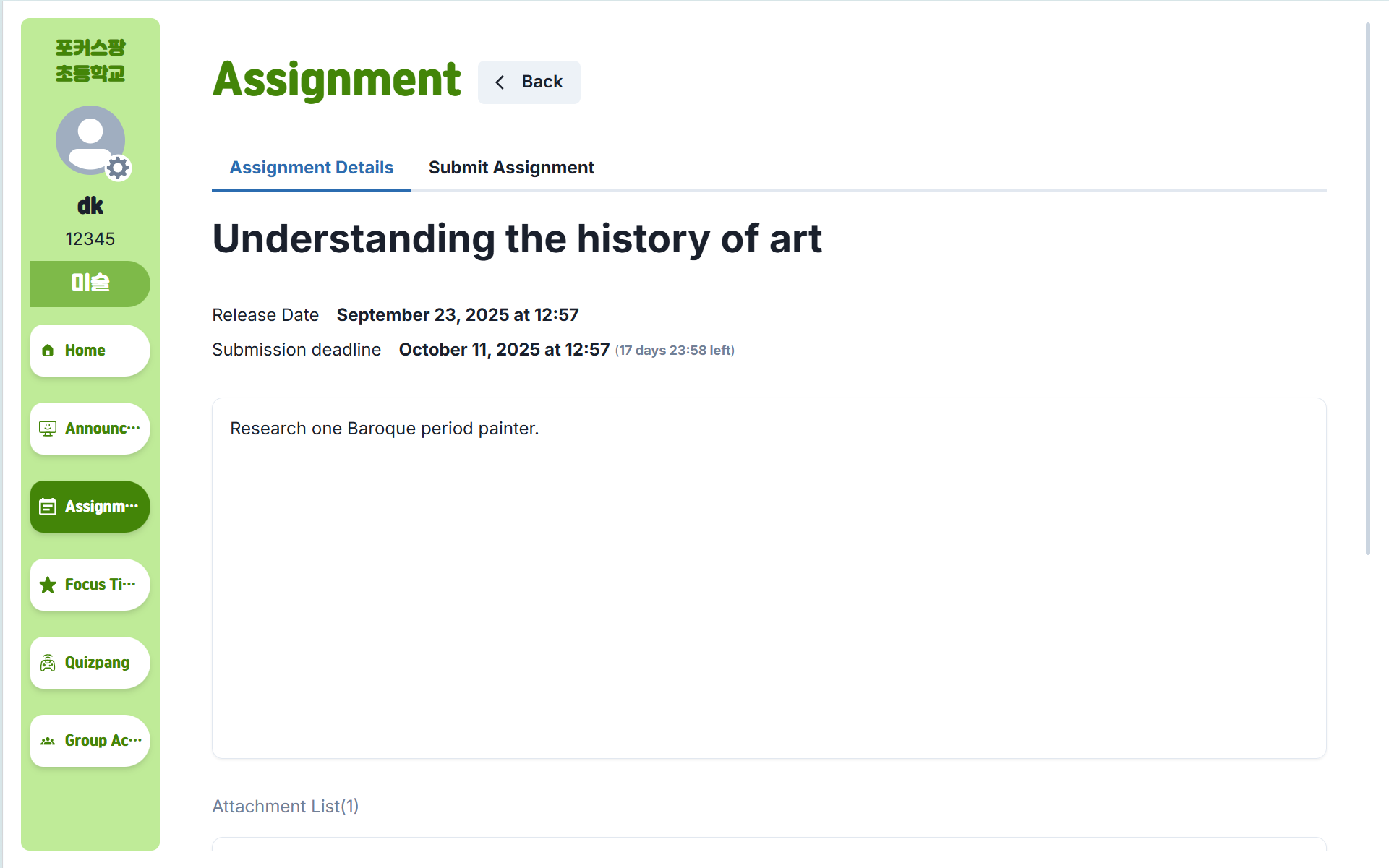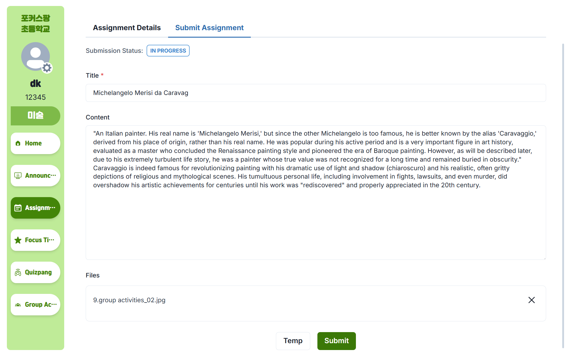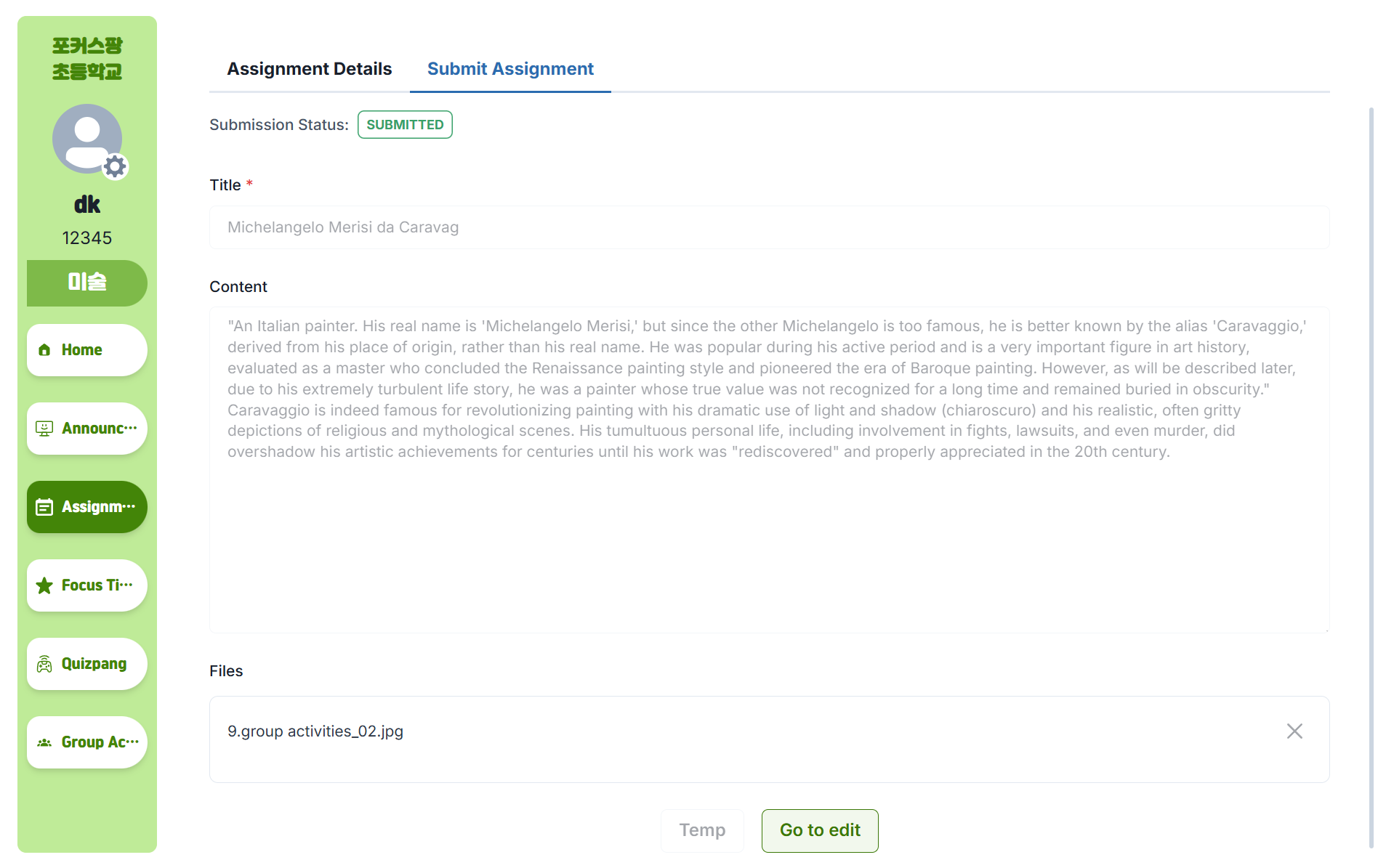 In the Submit Assignment tab, enter the title and content, then click Submit to turn in your assignment.