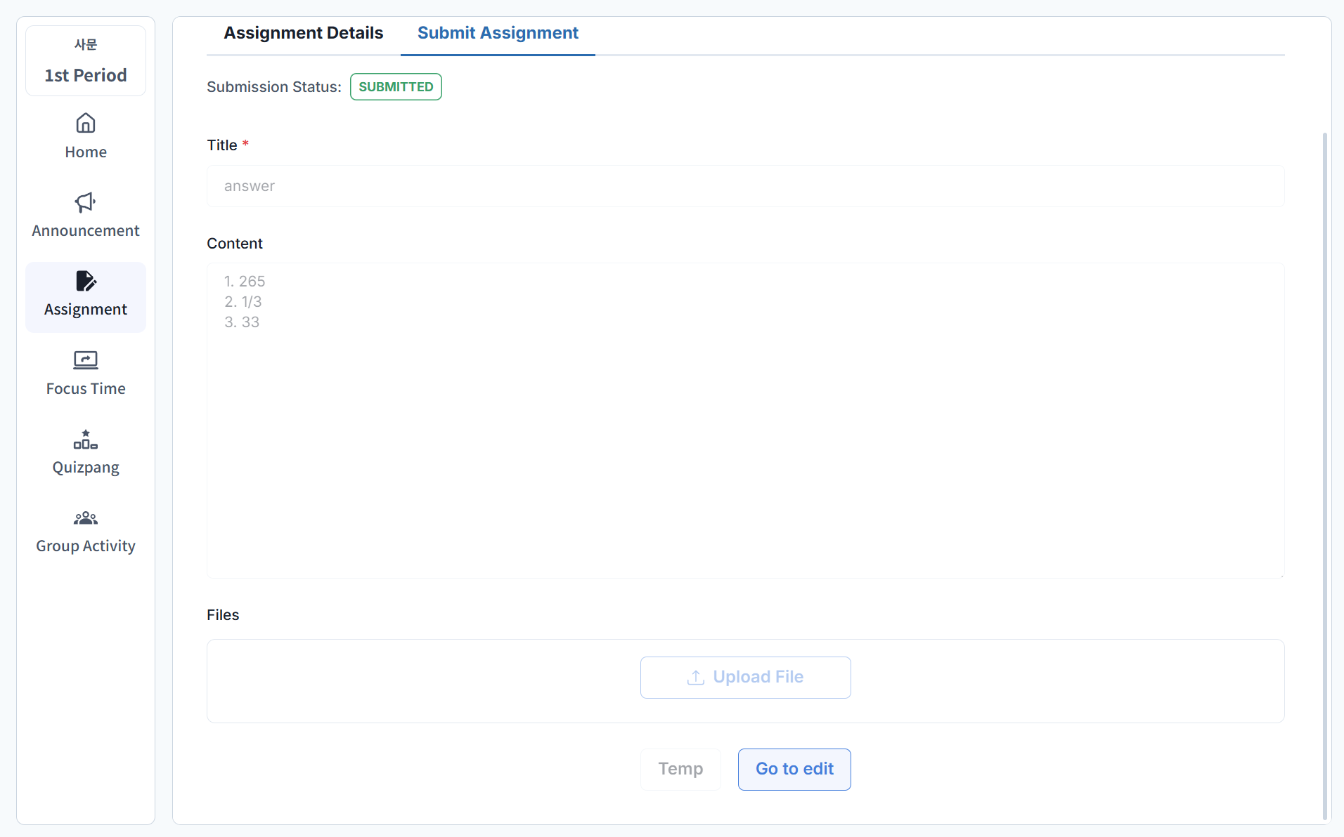 In the Submit Assignment tab, enter the title and content, then click Submit to turn in your assignment.