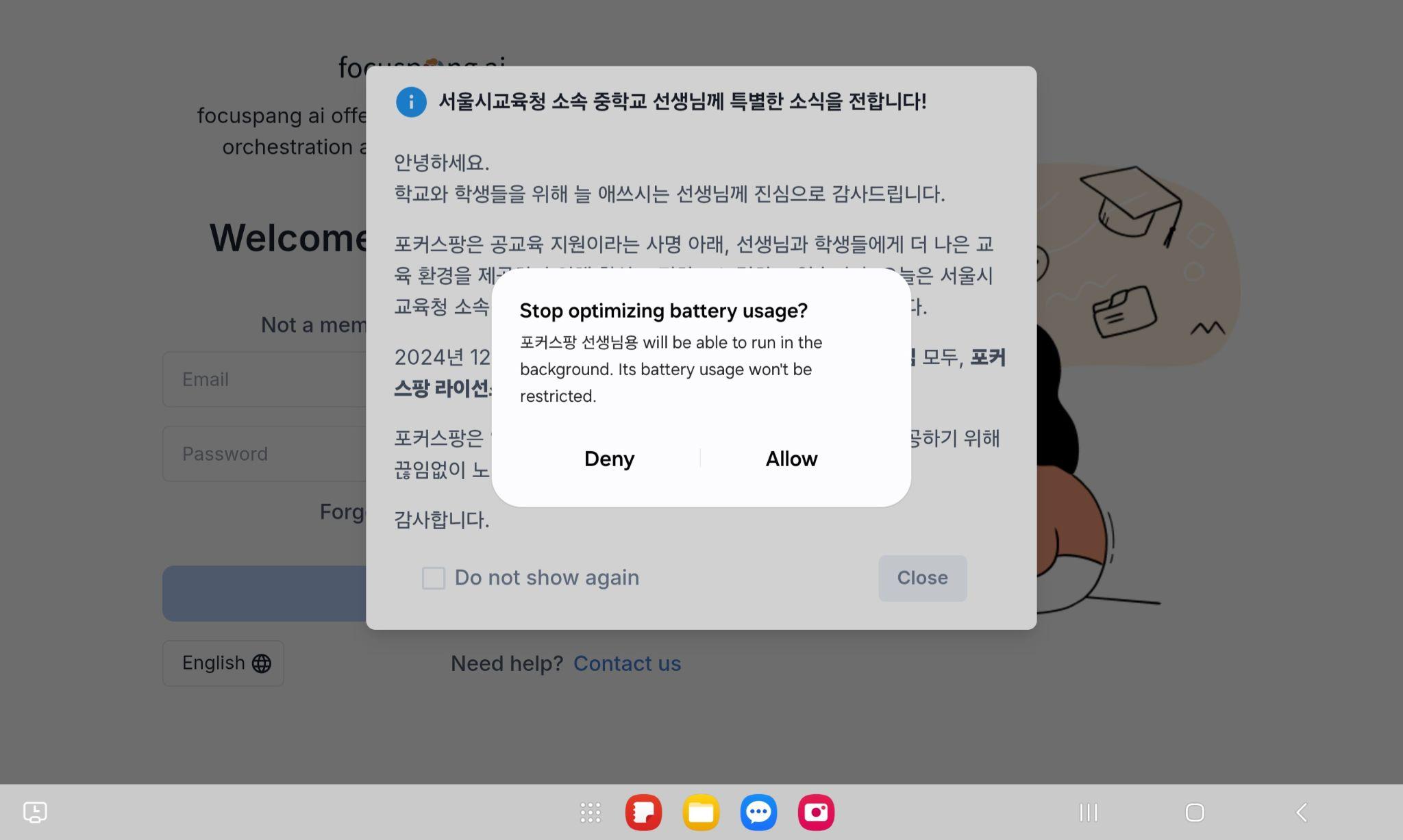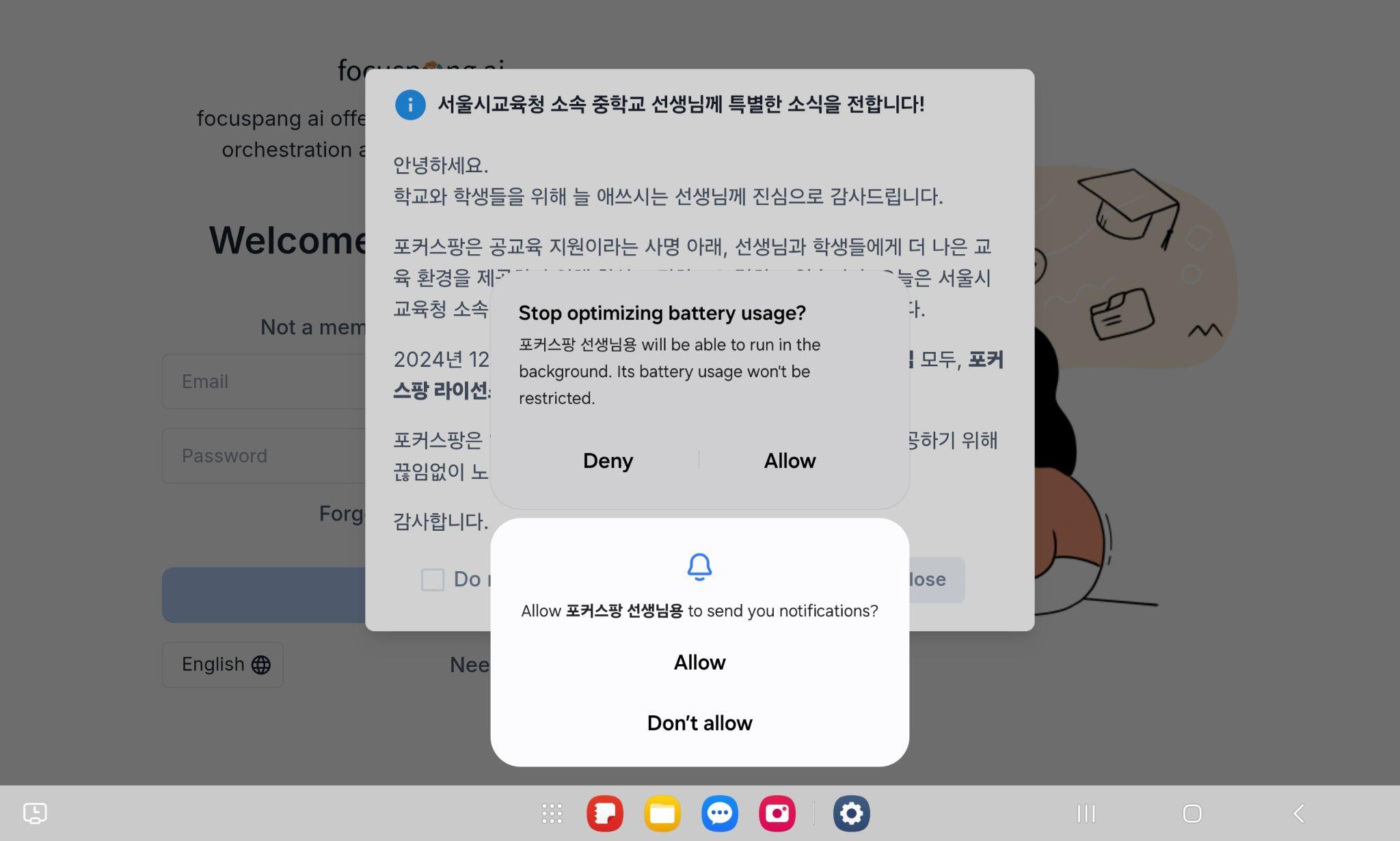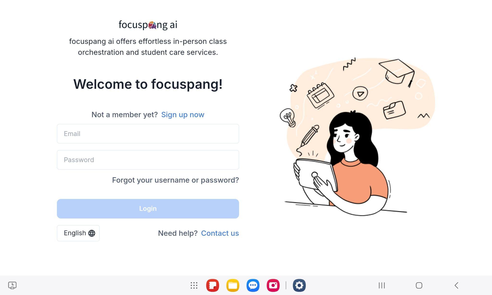 Using focuspang through a mobile browser (Chrome, Samsung Internet, etc.) may not work properly. Please make sure to install the focuspang Teacher on your Android device.